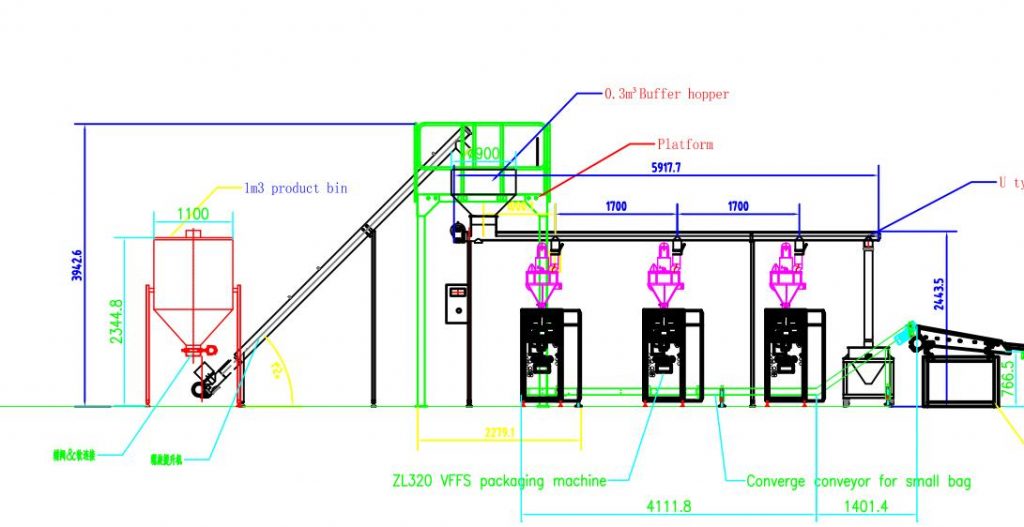 1, מכונת אריזה ליצירת שקיות Samll. חלק זה כולל הופר חומר גלם, מכונת הזנת בורג בשיפוע. הופר חיץ בינוני, ובורג הזנה אופקי לשליחת כל חומרי הגלם ל-6 סטים מכונת מדידת אוגר