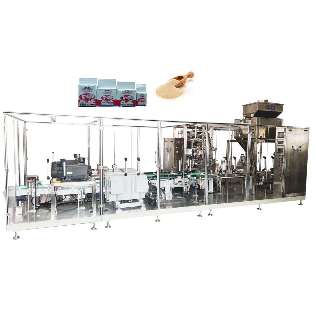 מכונה זו כולל סט אחד מעלית ואקום ZK3 להאכלת השמרים היבשים, סט אחד ZL520 שקית אנכית לייצור מכונת אריזה ואיטום. סט אחד ZLC4-2000 מכונת שקילה ארבעה דליים, סט אחד ZL-100V2 מכונת אריזה כפולה בתא ואקום. מכונה זו נמצאת בשימוש נרחב לאריזת כימיקלים לבית מרקחת מזון ומוצרים אחרים באבקה או גרגיר קטן. כמו אבקת קפה, אבקת שמרים קמח חיטה וכן הלאה. כל המכונה מאמצת פנימה שאיבה למוצר ואקום. דרגת הוואקום גבוהה מאוד ומהירות האריזה גבוהה מאוד יכולה להגיע ל30 שקיות/דקה. למוצר המוגמר יש חיי מדף ארוכים וצורה יפה.